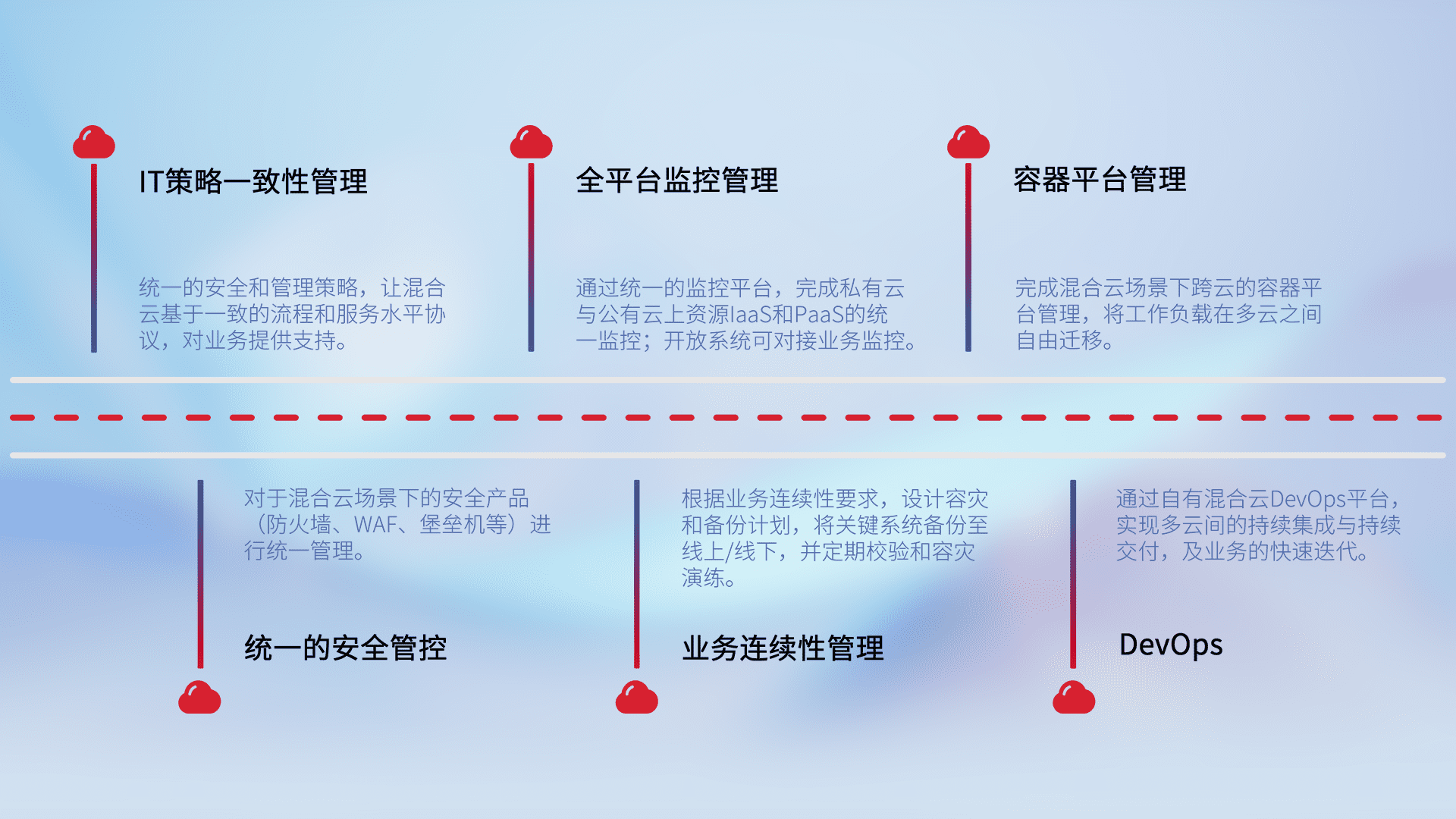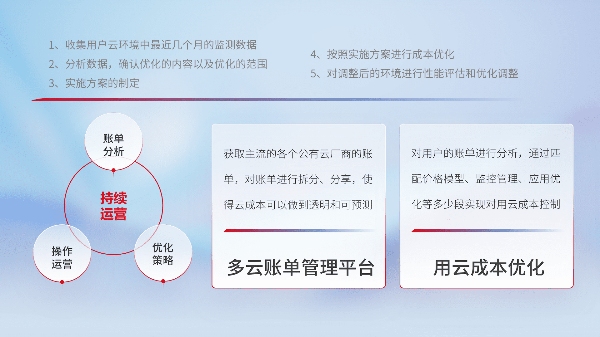通过多云纳管,,以统一的资源数据模型把客户的云资源进行抽象和封装,,进而实现对多云资源的统一操作,,保障云资源管理的可靠性、、、、稳定性与可用性。。量身定制化运维内容,,,,配置、、、开发运维、、、、补丁管理、、备份、、、、监控、、认证和访问管理、、、审计和日常巡检等,,,,保障在用云过程中的可靠度,,,稳定度以及高可用率。。